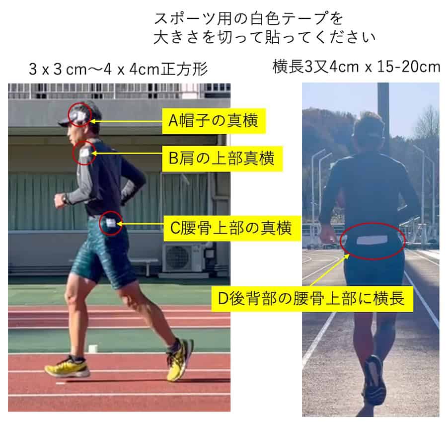 側面と背面の撮影は基本的に2台のカメラで同時撮影するのがベストです。しかし、一台しかない場合は側面と背面の撮影を異なるタイミングで撮影して下さい。その場合できる限り同じ速度を意識して走って下さい。なお、別時間撮影の場合は、フォームや速度の違いで精度が落ちることもあるのでご了解下さい。