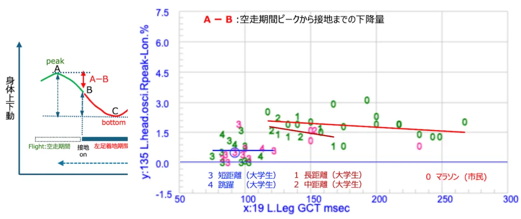 そこでさらに、「上下動」を着地のタイミングごとに分離したところ、「着地時間」との間により強い相関関係が見えて来ました。