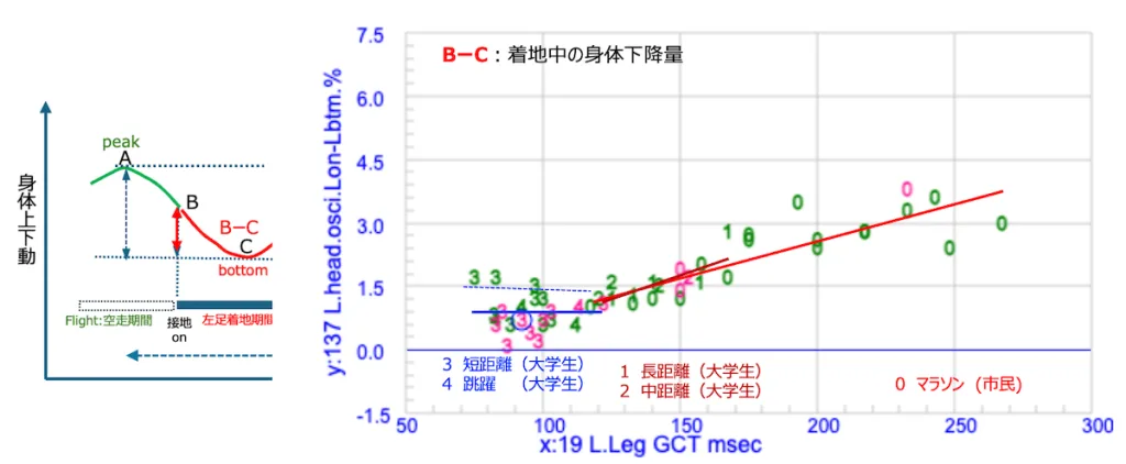 このタイミングは、左右の太腿の角度が揃うフォームになり、着地期間の制動(ブレーキ)から加速に切り替わるという特徴的なタイミングです。 - 以上の理由であれば、身体の下降量と膝の屈曲量が比例しても良さそうですが、3人の結果からは単純にそうとも言えませんでした。